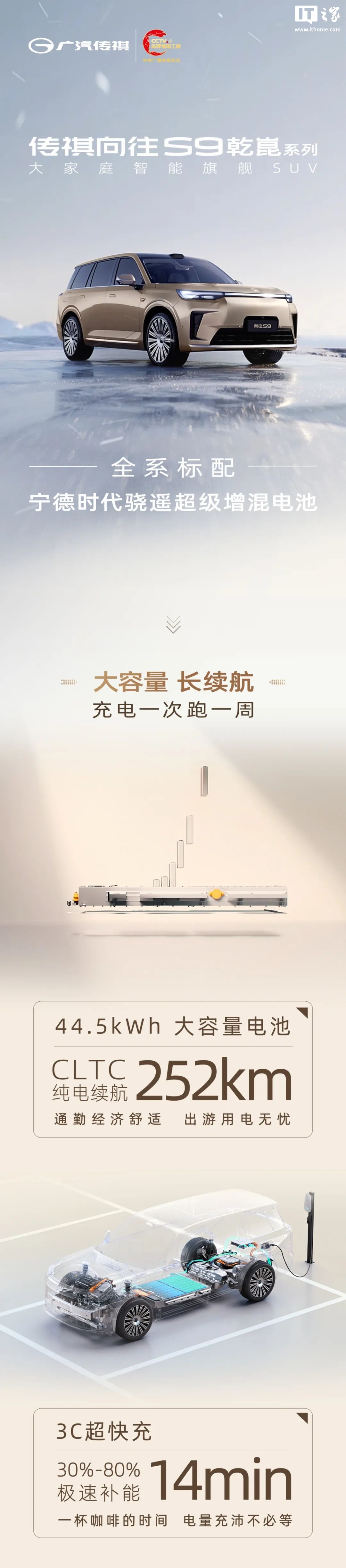 IT之家 8 月 13 日消息,据广汽传祺消息,向往 S9 大家庭智能旗舰 SUV 全系标配宁德时代骁遥超级增混电池短期股票配资门户,电池容量 44.5kWh、CLTC 纯电续航 252km。