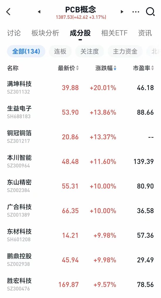 算力硬件股集体爆发,PCB、CPO方向领涨。截至收盘,满坤科技20%涨停,东山精密、广合科技等涨停封板。